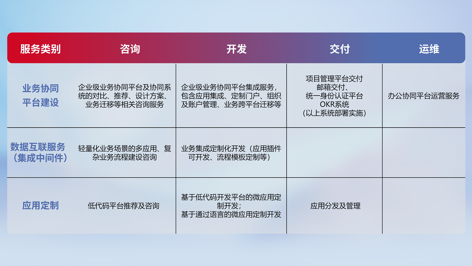 针对钉钉、、、、企微、、IDaas等平台级产品提供产品的规划、、方案、、、、交付、、、定制化开发等服务,,实现如统一协同办公、、、智能客户服务、、、混合会议管理、、、智能数据查询、、等业务场景,,,实现数字化转型。。。