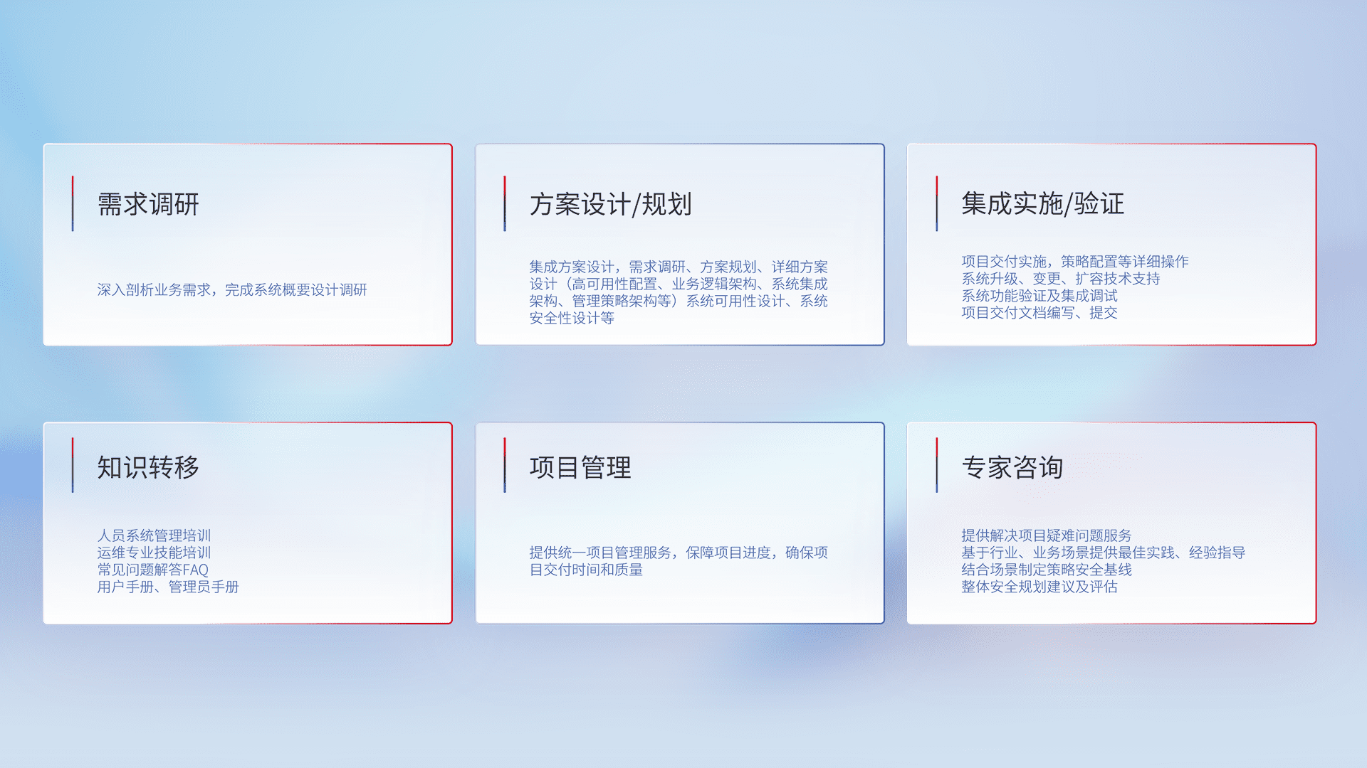 针对客户行业特性,,将宏观的安全战略和需求,,,通过专业的交付服务,,,实现项目落地,,为客户提供标准规范的集成交付服务。。。。